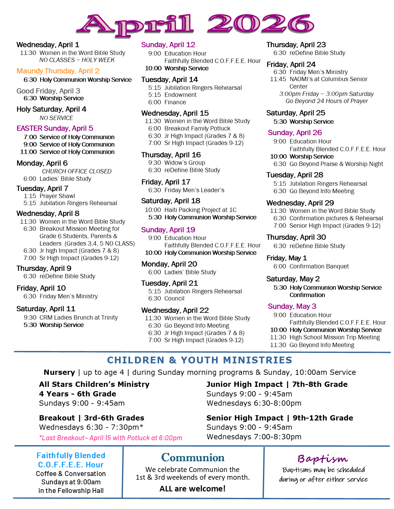 Breakout Families - Join us for our Breakout Family Picnic on Wednesday, April 15th, 6:00-7:00pm. Come as a family and bring a side dish, salad, or dessert to share. Hot dogs, chips, drinks, condiments, and table setting will be provided.